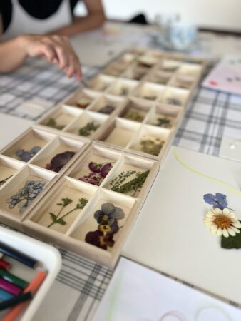 (内容)庭と風の草刈りの見学、押し花で描く自己探求ワークショップ